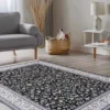 Give your room rich depth with the Amatis Adrianna Navy Blue Rug. A dark navy field is filled with an all-over pattern of scrolling vines and petite florals, framed by layered borders in soft grey and ivory with delicate pastel highlights. The refined palette grounds a space while the intricate design adds movement and character.