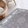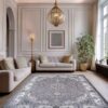 Soften your space with the Amatis Pargol Light Grey Rug. A gentle light-grey field is filled with scrolling vines and petite florals, centred with a detailed medallion and framed by layered borders in grey and ivory. Subtle accents of teal, rose and gold add quiet colour while the overall look stays calm and easy to style.