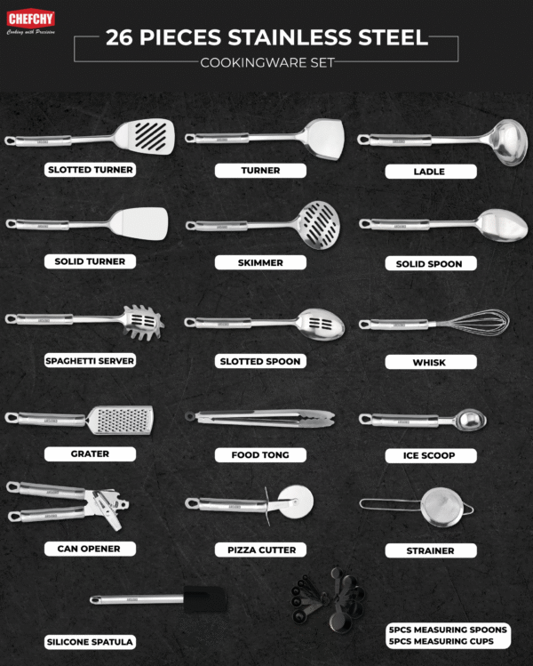 Have our CHEFCHY 26-Piece Stainless Steel Kitchen Utensil Set. Matches perfectly with our utensil kitchenware range. Buy CHEFCHY 26-Piece Stainless Steel Kitchen Utensil Set, a perfect addition in your kitchen that adds an elegant touch and also add a touch of your own style. All utensils come in an elegant and modern design, making them more than just a simple kitchen utensil, they are also a matching accessory for your kitchen. These are just a few options, though we have a lot to offer from our kitchenware selection.