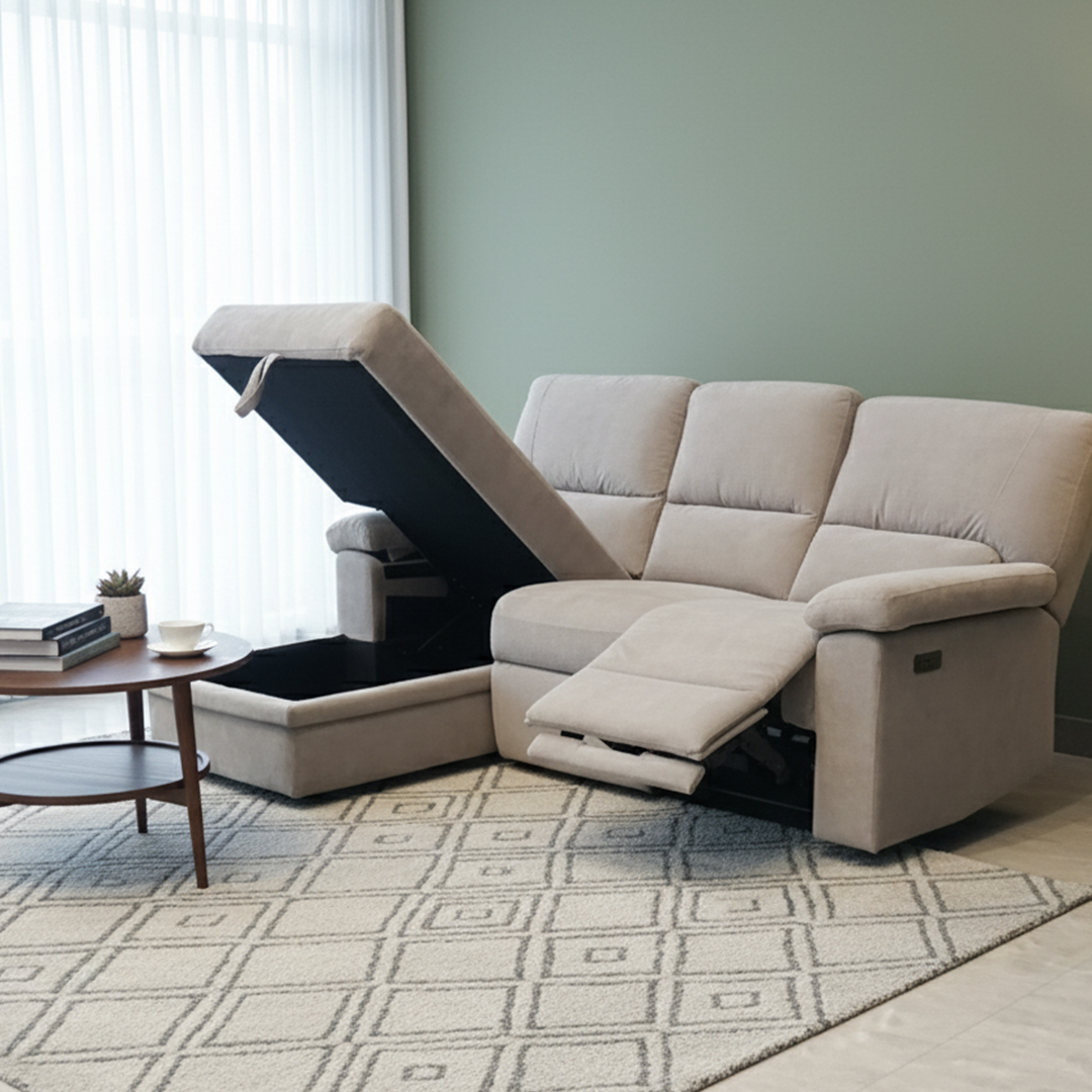 Smart Storage – hidden storage space under the chaise for blankets, cushions, or everyday essentials.
